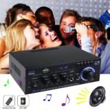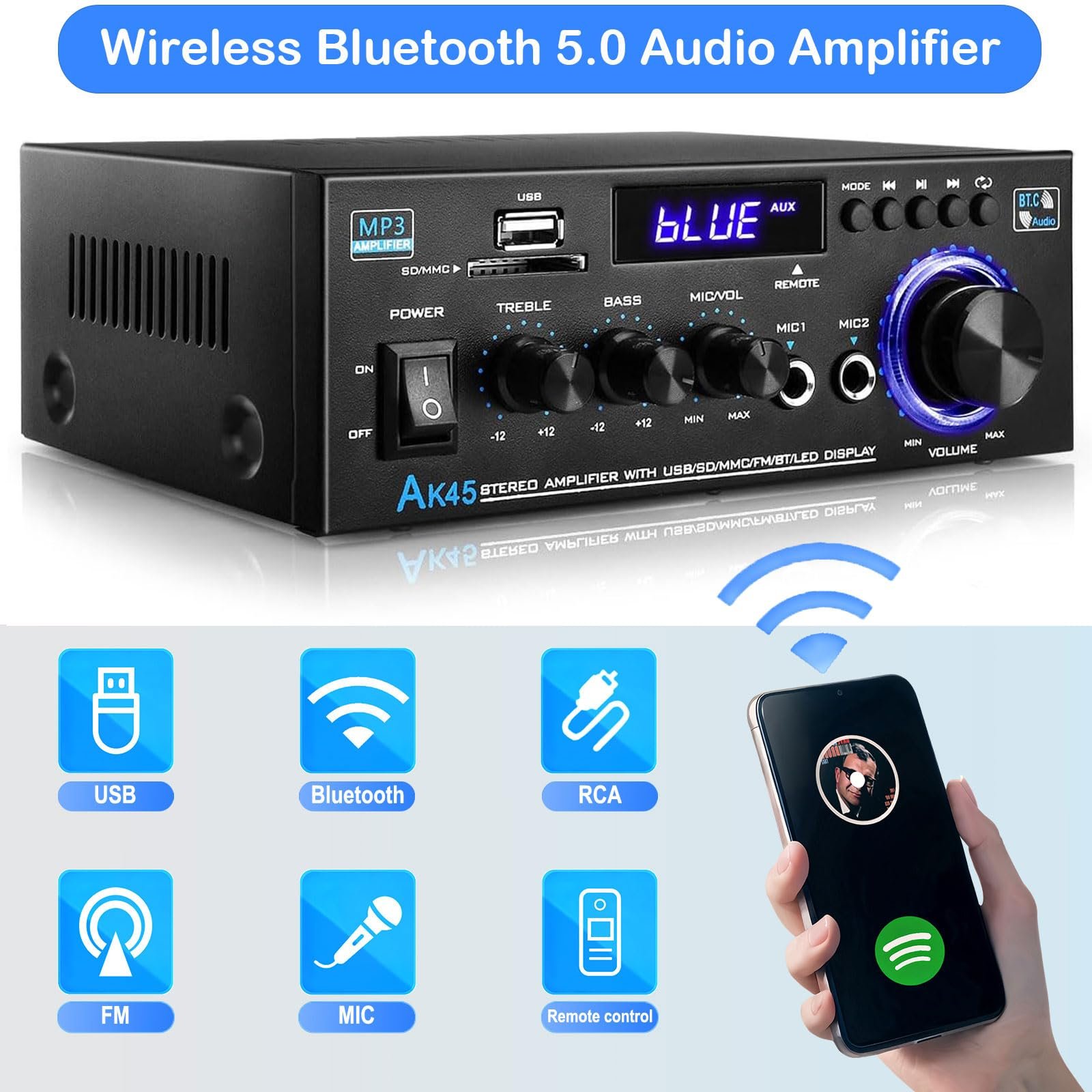 【Powerful Sound in a Compact Size】– AK45 Stereo Audio Amplifier delivers rated power RMS 50W + 50W to be used for multi-speaker 4-16 ohms impedance allowing you to enjoy high-performance speakers or components. It boasts roaring bass, crisp highs and an outstanding richness that most amps can only hint at. The 2 microphone inputs are nice & handy for karaoke or announcements. This amp’s low-profile design makes it easy to place in a room where space is tight.