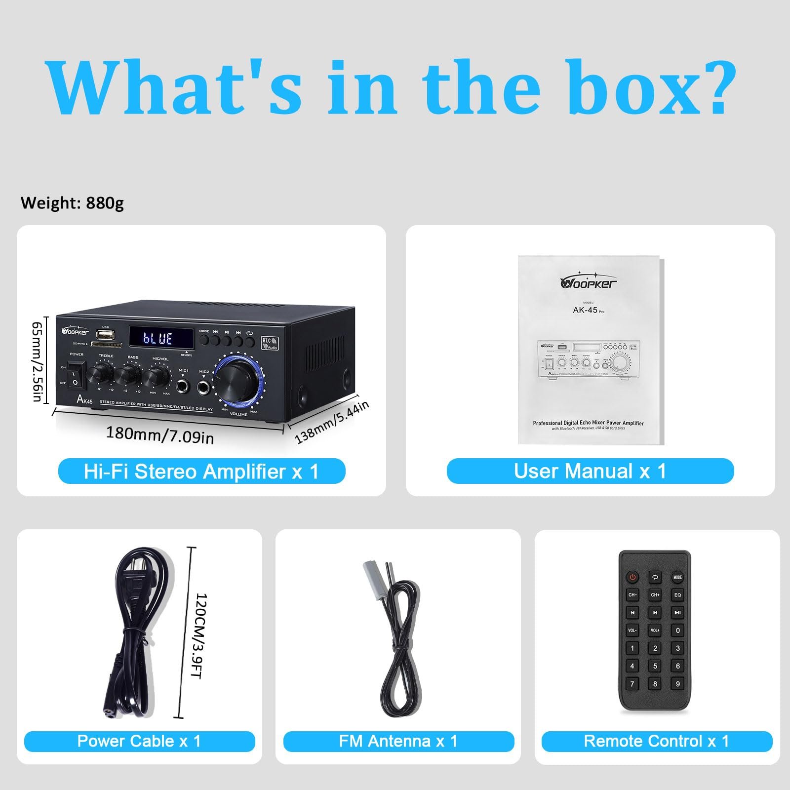 【Easy Operation】– AK45 HiFi Stereo amplifier Come with a remote control, it allows you to change audio settings from distance making you less tired and more comfortable. With bass and treble control knobs you can set the desired output of music according to your wish. Bright digital LED display lets you see the settings you change easily.