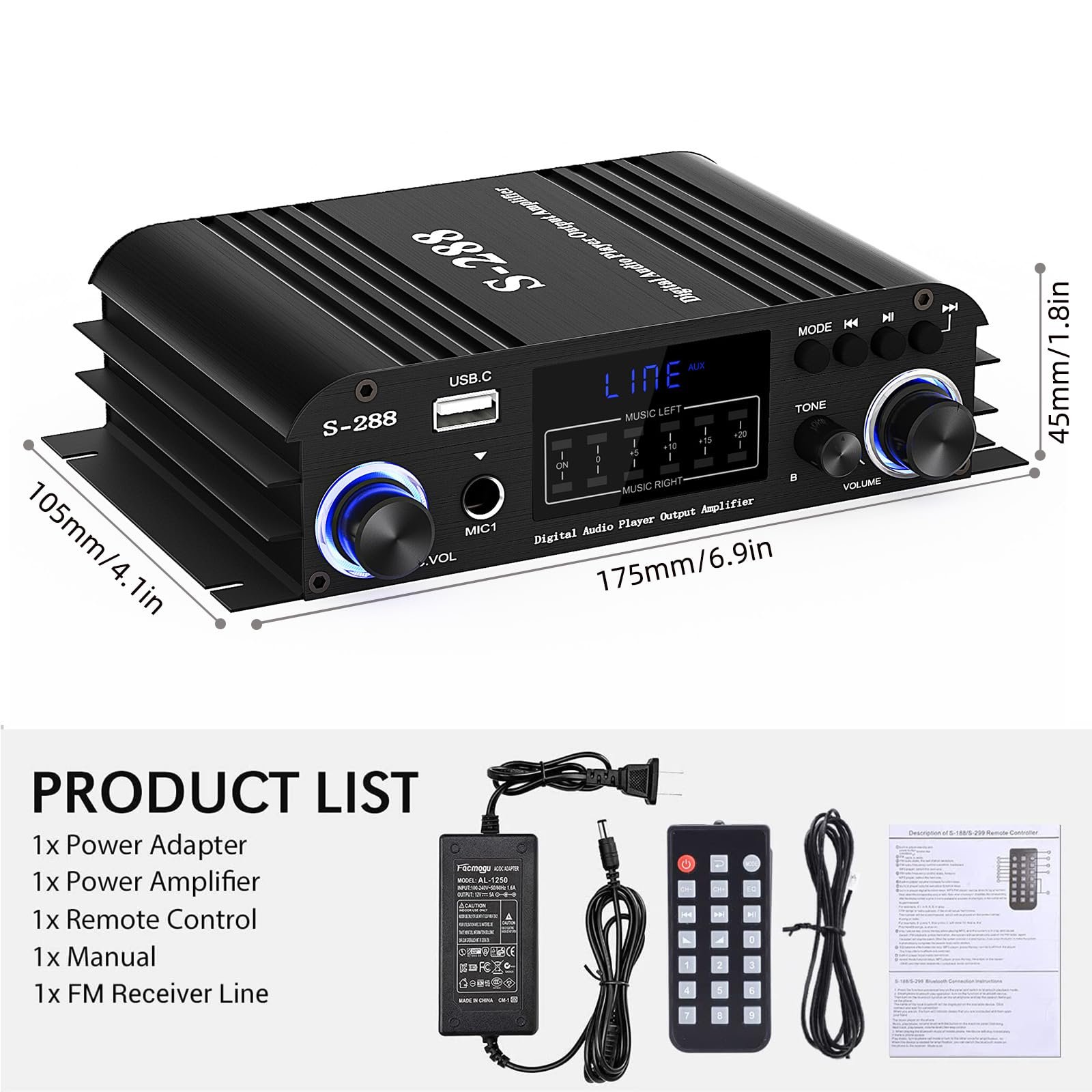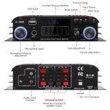 Facmogu S-288 4 CH Bluetooth 5.0 Home Audio Amplifier, RMS 45Wx4, Max 600W HiFi Stereo Power Amplifier USB, SD, FM Class D Speaker Amp for Home Theater Karaoke, with Power Adapter & Remote Control