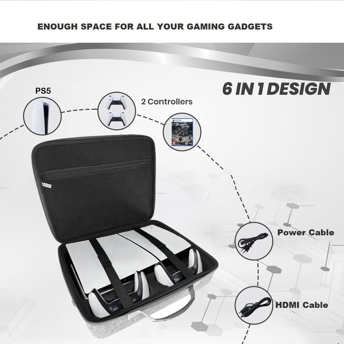• 【Perfect Design】 The Sturdy And Durable High-Quality Environmentally Friendly Hard Material, The Main Bag Of The Travel Suitcase Can Fix And Protect The PS 5 Slim System. The Front Pocket Can Hold 2 Ps5 Wireless Controllers, PS Game Disc, Ac Power Cord, Hdmi And Usb Cables